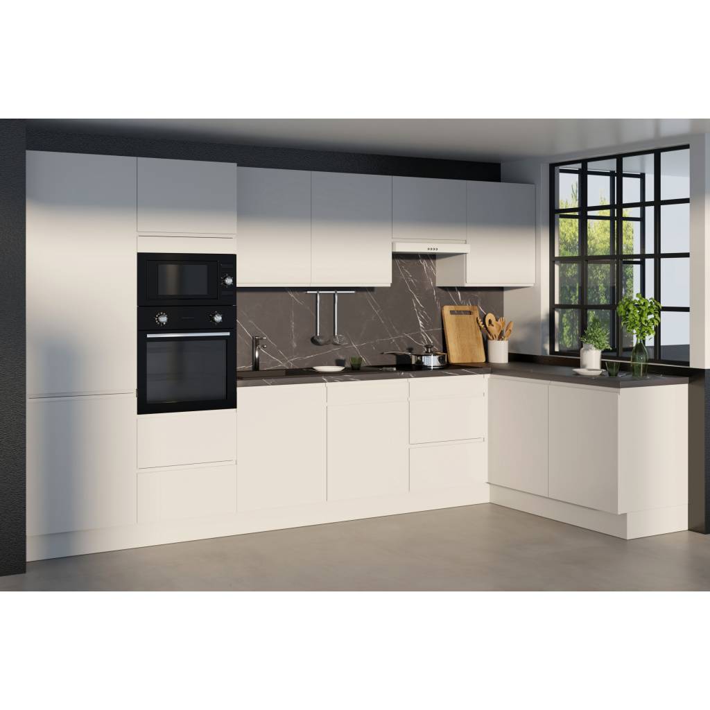Caissons épaisseur 16mm. Tiroir gris double paroi métallique. Coulisses amorties sortie totale. Charnières amorties.