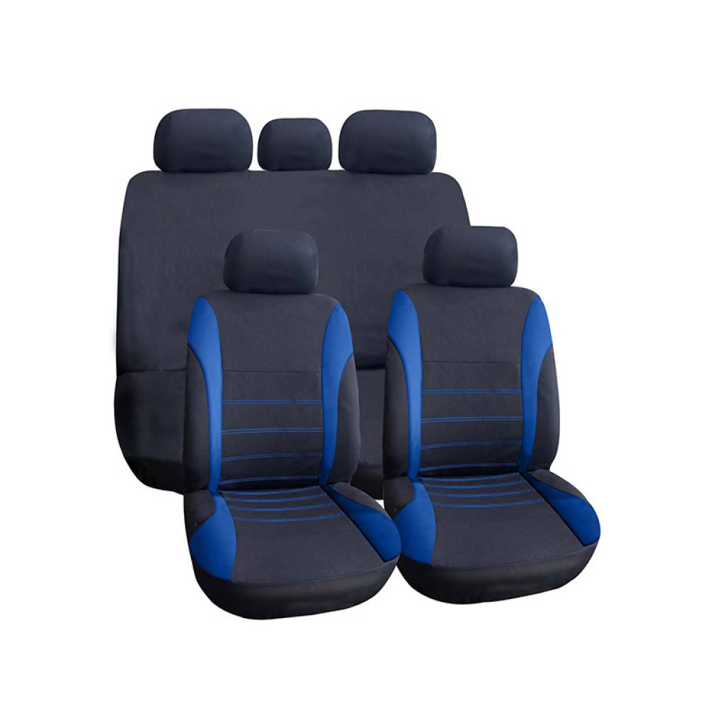Comprenant 9 pièces ( housses avant et arrière appuis têtes ) coloris bleu, rouge et gris.
