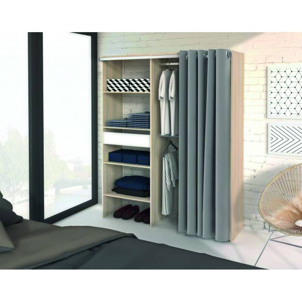 Dim. H1800xl.1434xp.480mm. Equipé d’un tiroir, penderie, et rideau. Coloris acacia clair
