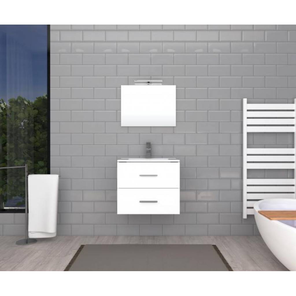 Meubles de salle de bain (FSC) • Miroir simple avec cadre arrière : L60 x H45cm, avec lampe en T L30cm (HOMER-ABS-CHROME) • Dimensions du bassin en céramique blanche: L60 X H46cm • Dimensions de l’armoire: L60 X L46 X H52cm (y compris l’épaisseur du bassin) • Panneau avant / latéral en MDF 15mm avec mélamine blanche brillante • Intérieur en mélamine blanche • 2 tiroirs avec fermeture en douceur, demi – ouverture, demi – plaque de base, Avec poignée alum • Support mural