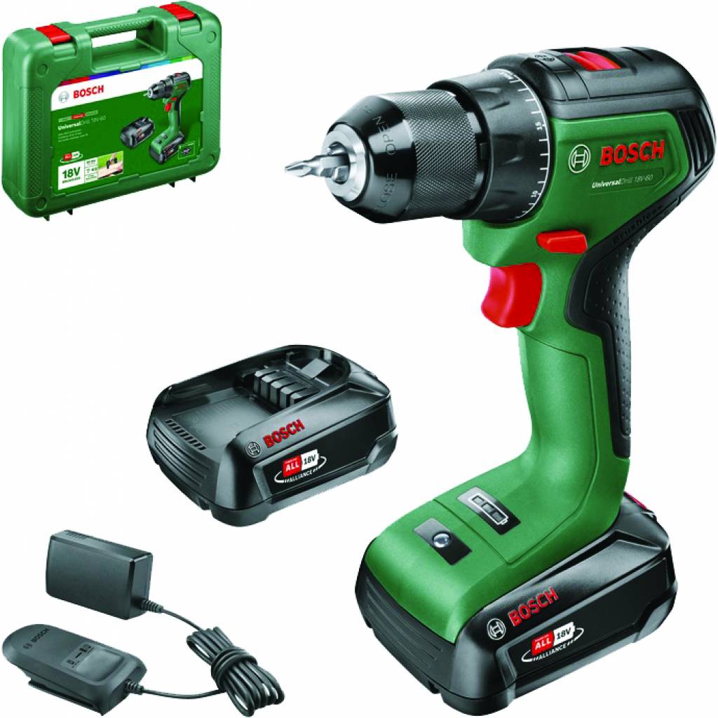 Puissance 18 volts, intensité de la batterie 2 Ah, mandrin 10mm.Perceuse sans fil UniversalDrill 18V-60 Brushless (2 batteries) Perceuse polyvalente, robuste et durable, idéale pour des travaux dans le bois, le métal, et le plastique. – Moteur Brushless pour une puissance maximale et une durée de vie nettement plus longue. – Parée de la technologie Syneon, elle apportera des performances optimales tout au long des travaux.