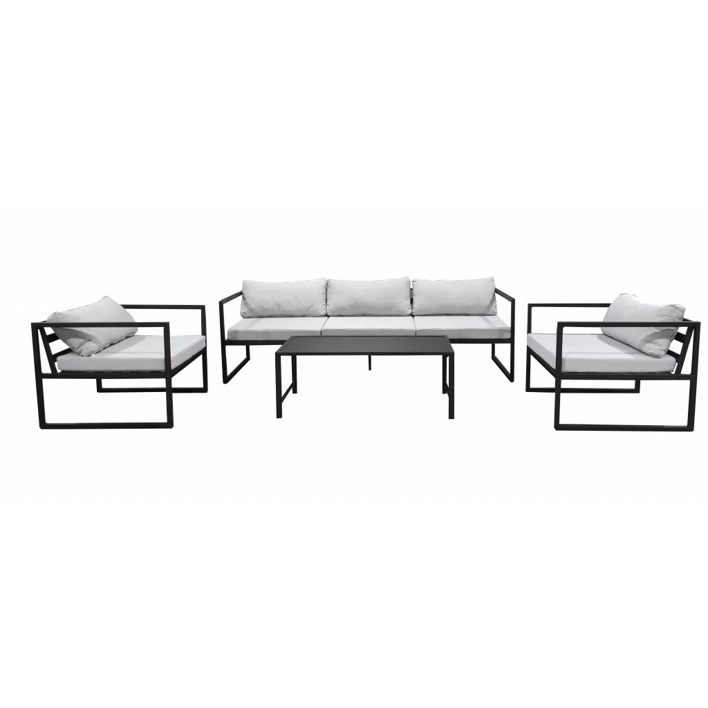 Structure en acier, plateau de la table avec des lattes en polyester, dim. du sofa 3 places 200 x 71 x 58,5 cm , dim. du fauteuil 70 x 71 x 58,5 cm et la table 100 x 50 x 38,5 cm.