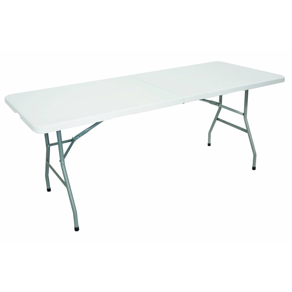 Table rectangulaire droite, qualité professionnelle, plateau en résine, structure et piètements en acier émaillé, poids 14 kg, dim. pliée : 74 x 90 cm et dépliée : 74 x 180 cm.